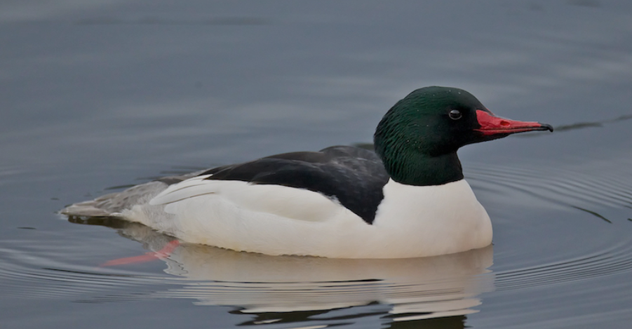 This large, fish-eating duck has a long, slender, serrated bill perfect for catching fish. The male’s clean white body and dark green head can be mistaken for a loon’s sharp black-and-white patterning, especially in winter when loons have a more muted appearance. Its low profile in the water and diving behavior further the resemblance.