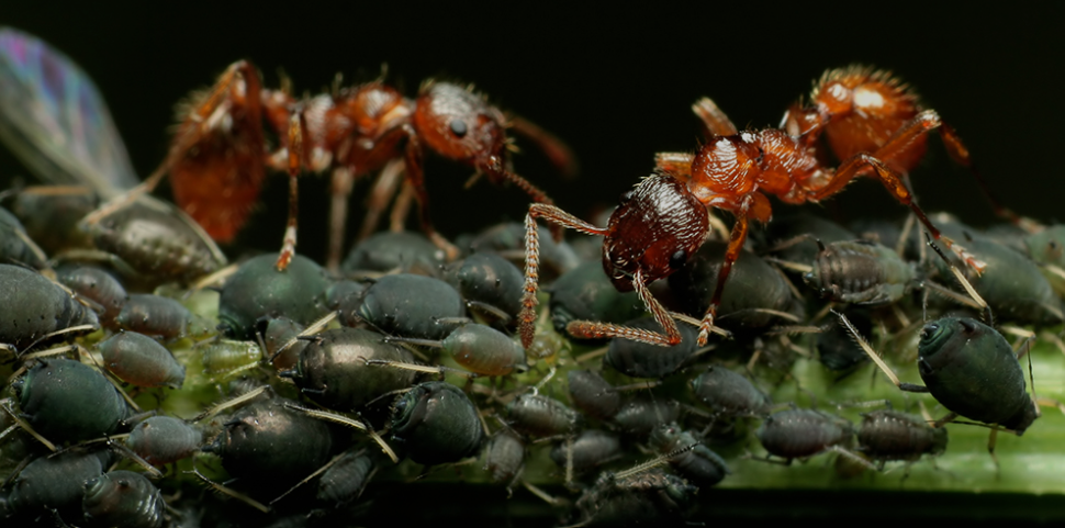This common European ant is one of the most frequently observed aphid farmers. They aggressively protect colonies of aphids on rose bushes, broad beans, and many other garden plants. The ants will move the aphids to new, succulent growth and defend them fiercely from ladybugs and other predators in exchange for honeydew.