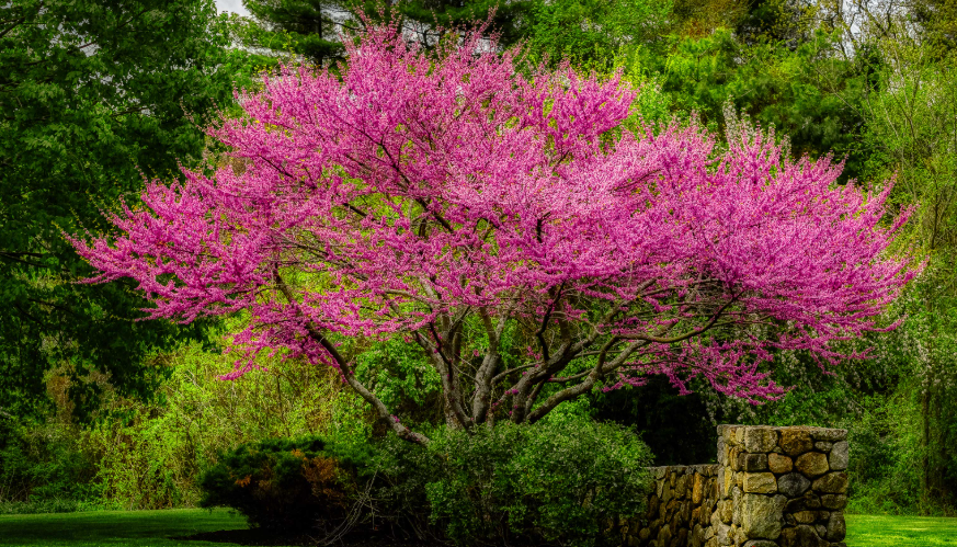 The Eastern Redbud is one of North America’s most charming native ornamental trees and a superb choice for front yard landscaping. In early spring, before any leaves appear, its bare branches become completely covered with small but vivid magenta-pink to rosy-purple flowers that emerge directly from the bark along the twigs and even the main trunk — a trait called cauliflory — creating a stunning, fairy-tale effect.
