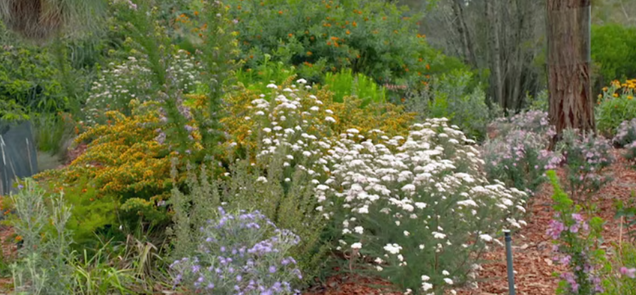 Common yarrow is a remarkably tough, drought-tolerant perennial that can colonize the dry, nutrient-poor soil beneath eucalyptus. Its finely divided, feathery, aromatic grey-green foliage forms spreading mats, topped in summer with flat-topped clusters of white, yellow, pink, or red flowers. It spreads by rhizomes, filling in gaps under the tree canopy, and is notably unbothered by the allelopathic compounds in eucalyptus leaf litter.