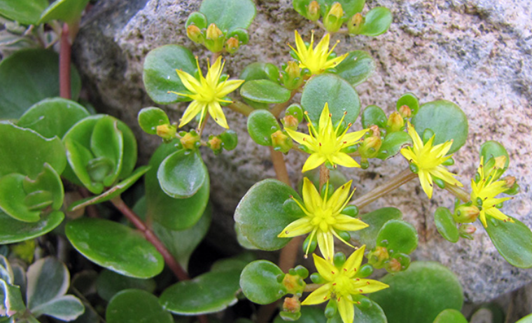 One of the most vigorous and cheerful of all stonecrops, Biting Stonecrop forms dense, mossy mats of tiny, plump green leaves that carpet walls, pavements, and rocky ground. In early summer it explodes into a blaze of bright, starry yellow flowers that almost completely obscure the foliage. Despite its diminutive size it is extraordinarily tough, tolerating drought, poor soil, and hard frost alike.