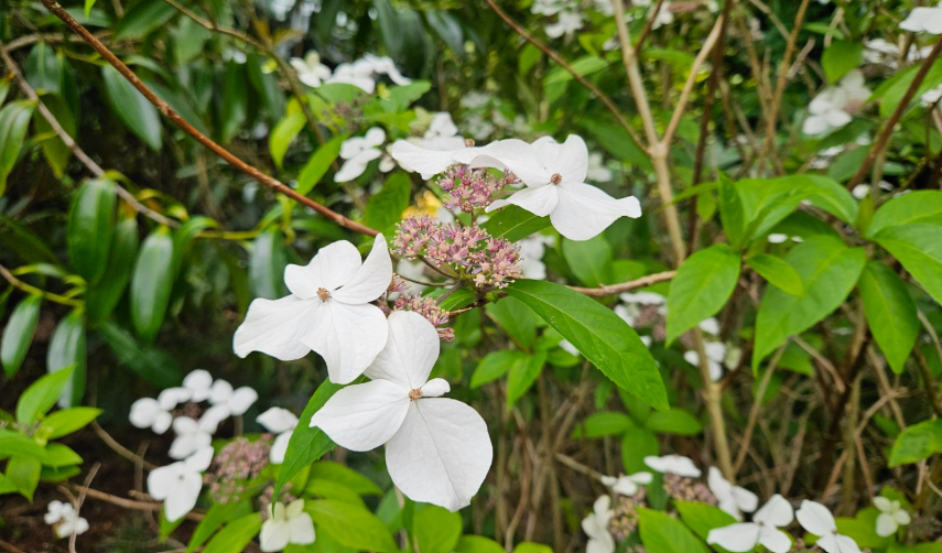 The Mountain Hydrangea is a smaller, more refined relative of the Bigleaf Hydrangea, native to mountain woodlands and stream edges in Japan and Korea — habitats that have shaped it into a tougher, more cold-tolerant species. It is identified by its narrower, more elongated and sharply pointed leaves compared to the broader, rounder leaves of H. macrophylla, and by its characteristically smaller, lacecap-style flower heads featuring a ring of sterile outer florets surrounding a compact centre of tiny fertile flowers.