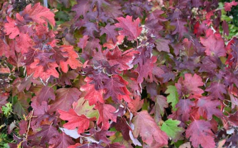 The deeply lobed, multi-pointed oak-shaped leaves are a rich, deep glossy green in summer, turning outstanding shades of orange-red and deep burgundy in autumn. Its flower panicles are full and densely packed with showy sterile florets, giving them an opulent, plush quality. The exfoliating cinnamon bark on mature stems remains a key winter feature. It grows to one and a half to two metres and performs beautifully in partial shade.