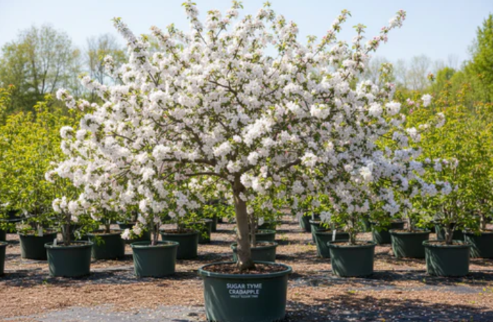 Si gar Tyme is normally planted as a potted nursery specimen in the fall, or sometimes as a bare root tree. Compared to other crabapple cultivars, it is relatively fast-growing but short-lived. Sugar Tyme reaches flowering and fruiting maturity within three to five years, but the lifespan is rarely more than a couple of decades.