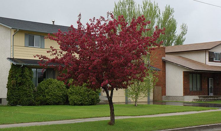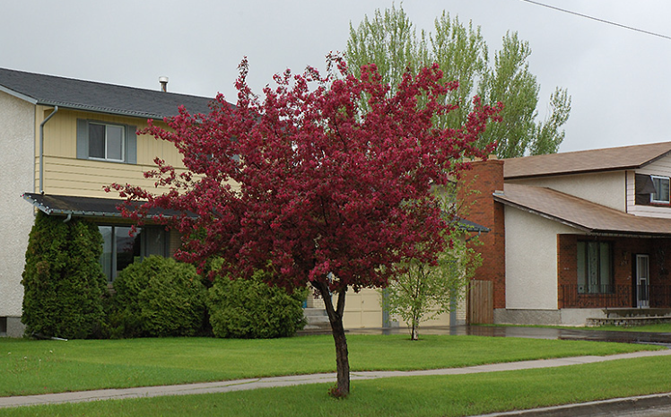 The foliage holds its dark purple color better than most crabapples through the summer heat. Small, dark red fruits follow in autumn. It grows to approximately 6 to 8 meters and is one of the most reliable ornamental crabapples for very cold climates, tolerating temperatures as low as minus 40 degrees.