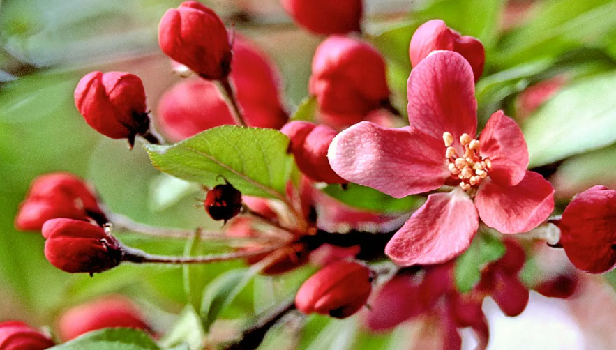 It produces large, deep pink to carmine-rose flowers from red buds in spring, covering the spreading canopy in a vivid, warm-colored display that is among the most generous of any crabapple. Red to orange-red fruits follow in summer and autumn, ripening early — earlier than most crabapples — and providing a swift seasonal food source for birds. It grows to approximately 7 to 9 meters with a broad, spreading crown.