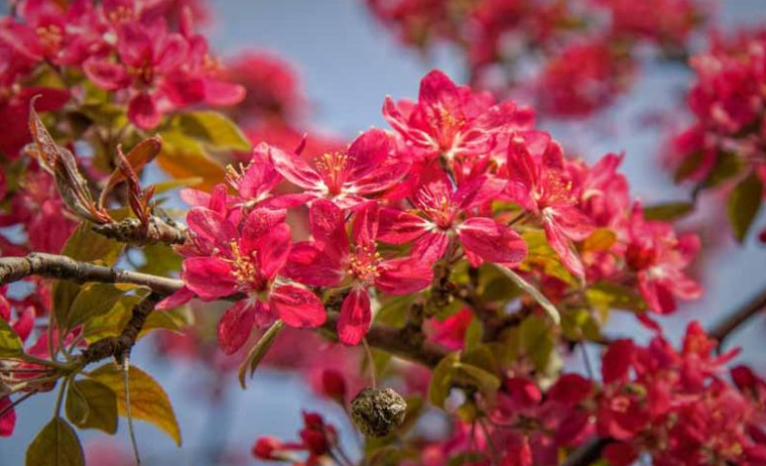 Robinson is a vigorous, rounded crabapple cultivar that produces one of the most intensely colored spring floral displays of any crabapple, with deep, vivid crimson-pink to magenta flowers that cover the tree in a breathtaking cloud of rich color. The foliage emerges a warm reddish-bronze in spring, gradually maturing to a dark, somewhat bronzy green through summer.