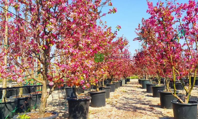 In spring it produces an outstanding display of deep carmine-pink flowers from deep red buds, covering the dense canopy in vivid color. Persistent, deep red fruits follow in autumn and winter. The foliage is a clean, dark green with good resistance to scab, rust, and fire blight. It grows to approximately 6 to 7 meters.