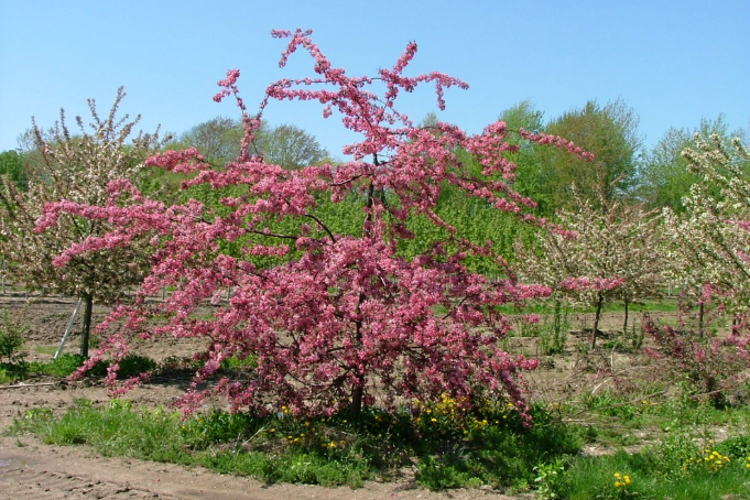 It produces an extravagant show of large, deep rose-pink to magenta-red flowers from dark red buds in spring — one of the most floriferous and vividly colored spring displays of any crabapple. The foliage emerges bronze-purple and the fruits are large, deep red, and edible, used historically for making jelly and preserves. While susceptible to apple scab, its extraordinary flowering performance continues to make it popular in cold northern gardens.