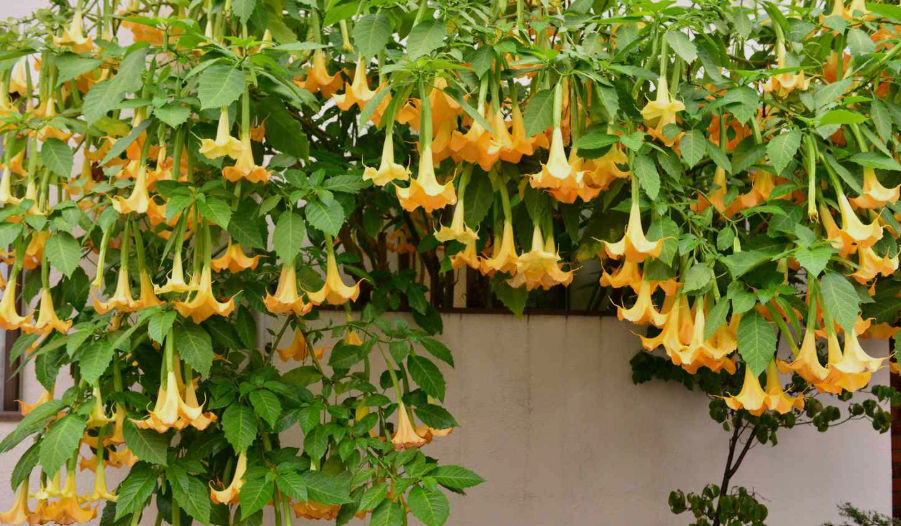 - Brugmansia suaveolens – Known for large, fragrant white to cream flowers and prolific blooming.