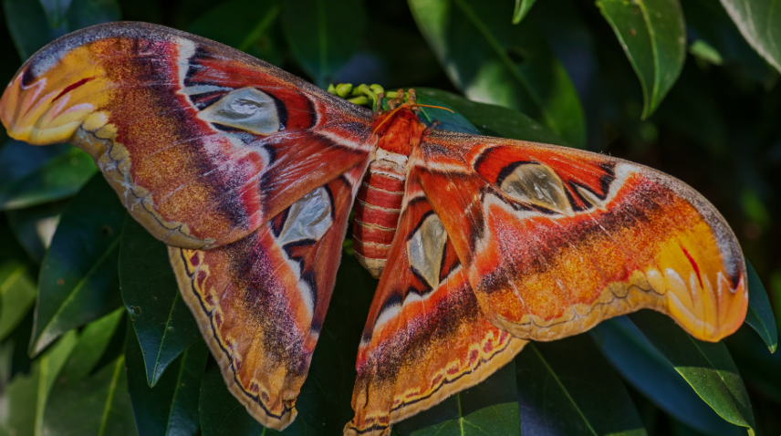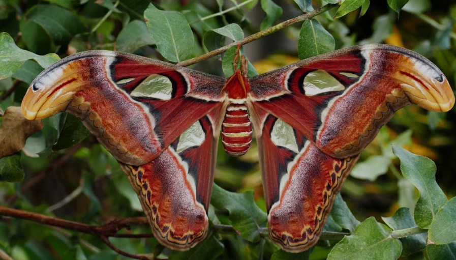Atlas Moths are famous for their extraordinary wingspan, which can reach up to 10–12 inches (25–30 cm), making them among the largest lepidopterans on Earth. The wings are reddish-brown with intricate patterns of white, black, and pink, along with large triangular markings that resemble windows.