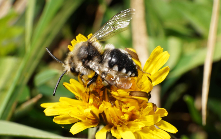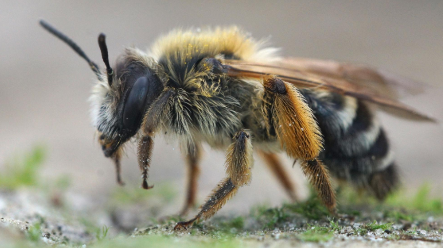The Mining Bee typically shows faint striping with earthy tones of brown, black, and pale bands. These bees nest in the ground, digging tunnels in sandy or loose soil. They are among the earliest bees to emerge in spring.