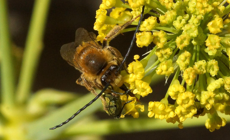 Long-horned Bee species often have striped abdomens and are notable for the males’ extremely long antennae. These solitary bees are active pollinators, particularly for wildflowers, and their striping helps distinguish them from similar species.