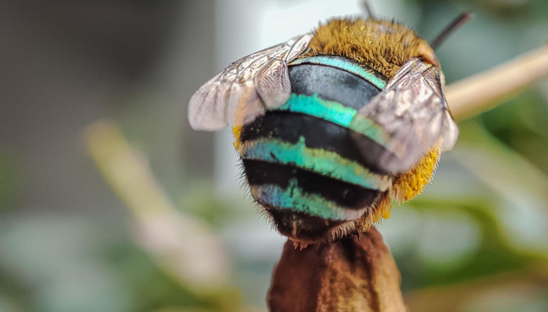 The Blue-banded Bee is easily recognized by its striking electric-blue stripes across a dark abdomen. These fast-flying bees are common in warm regions and are known for their ability to hover like tiny helicopters while feeding on nectar. They are excellent pollinators and play a key role in “buzz pollination,” especially for crops like tomatoes. Unlike honey bees, they are solitary and nest in burrows or crevices.