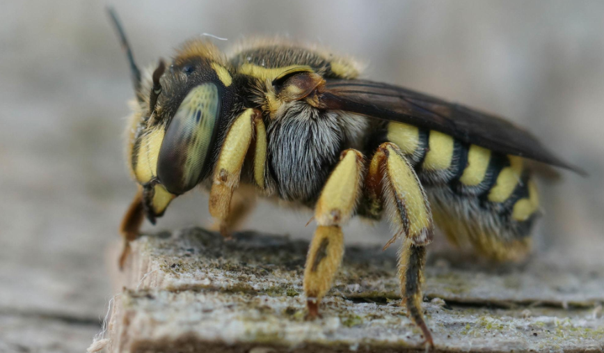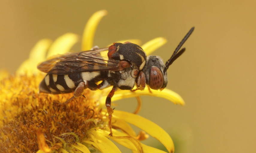 Cuckoo Bee species often have bright yellow and black stripes resembling wasps. They are parasitic bees, laying their eggs in the nests of other bees. Their bold striping may mimic stinging insects, helping deter predators.