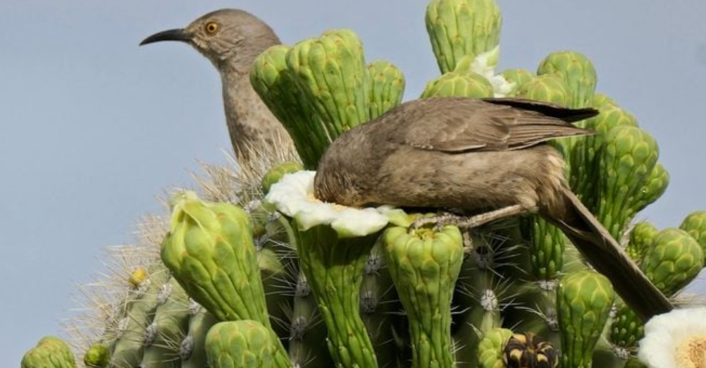Its short, slightly curved bill — shorter and less dramatically curved than most other thrashers — is an adaptation for foraging in denser, less open desert scrub than the more arid-adapted Le Conte’s Thrasher. It nests in cholla cactus and thorny desert shrubs and is one of the earliest nesting birds in the desert Southwest, sometimes beginning egg-laying in February.