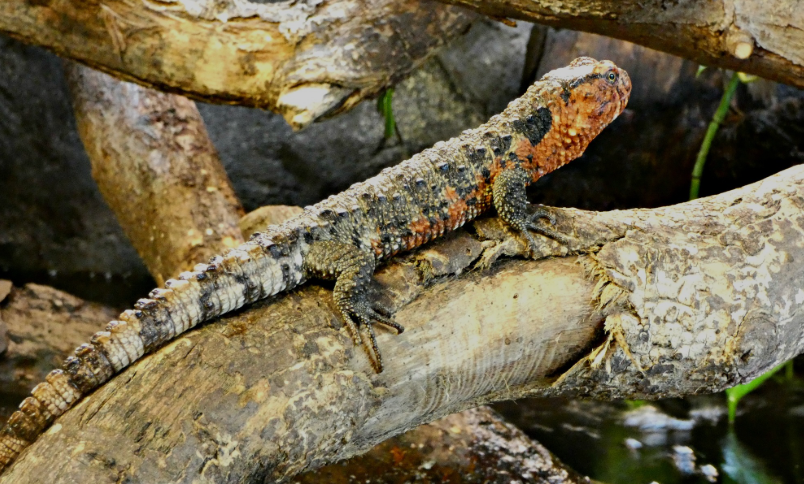 The species exhibits sexual dimorphism, with males being larger and more vibrantly colored, especially during breeding when their hues intensify. Juveniles are similar but smaller, and the lizard’s overall appearance includes a flattened, elongated body with dark brown or black scales interspersed with yellowish-green ones, along with a dorsal crest for added camouflage in its environment. Gray-brown base coloration with red-orange markings along the throat and sides is also common.