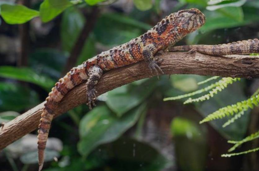 Physically, the Chinese crocodile lizard measures 40–46 cm (16–18 inches) in length, featuring a green body with reddish necks and alternating light and dark banded patterns. Its most distinctive traits include rows of enlarged, bony scales along its back and a muscular, flattened tail that resembles a crocodile’s, aiding in swimming and balance.