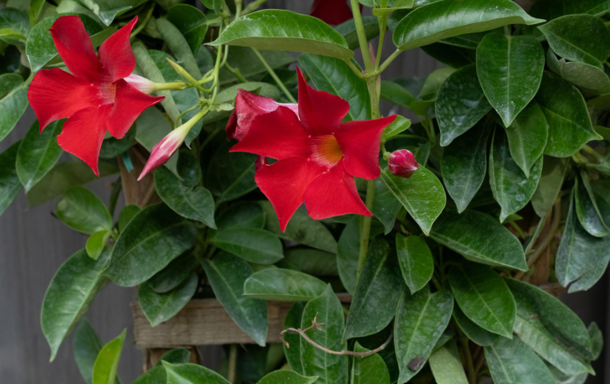 A compact relative of mandevilla, dipladenia produces funnel-shaped flowers in deep red and crimson on stems that climb or trail depending on the support offered to them.