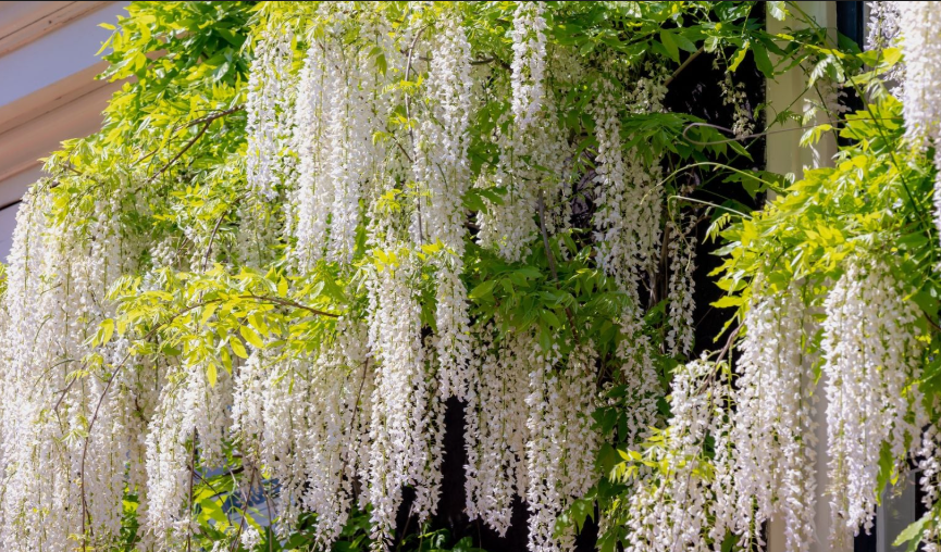 A specific white wisteria variety renowned for producing exceptionally long flower racemes — among the longest of any wisteria selection — in pure white with a faint sweet scent that is slightly less intense than the purple forms.