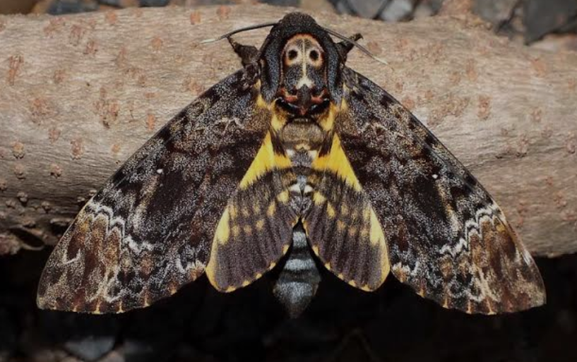 The Death’s-head Hawk Moth is medium to large in size, with a wingspan of 3.5 to 5 inches (90–130 mm). Its forewings are mottled brown and black, providing excellent camouflage against tree bark, while the hindwings are yellow with dark bands. The most distinctive feature is the yellowish marking on the thorax that resembles a human skull, giving the moth its name. Another unusual trait is its ability to produce a squeaking sound by forcing air through its proboscis—an adaptation used to startle predators or mimic sounds within beehives, where it often raids honey.