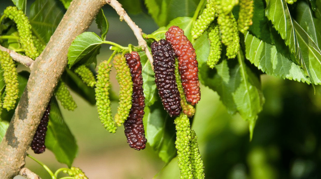 Mulberry trees can grow in locations with partial shade, though fruiting may be lighter than in full sun. Their adaptability makes them suitable for shaded gardens or edges of forests. They produce sweet, juicy berries that can still ripen under dappled sunlight.