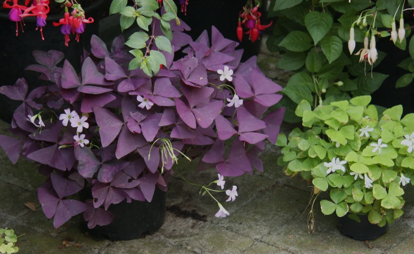 - Oxalis triangularis (Purple Shamrock): Known for its deep purple, triangular leaves and light pink or white blooms.