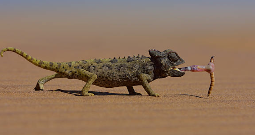 One of the largest chameleons in Africa, it is uniquely adapted to the desert. It changes color primarily for thermoregulation, turning black in the cool morning to absorb heat and a pale grey to reflect the intense midday sun.