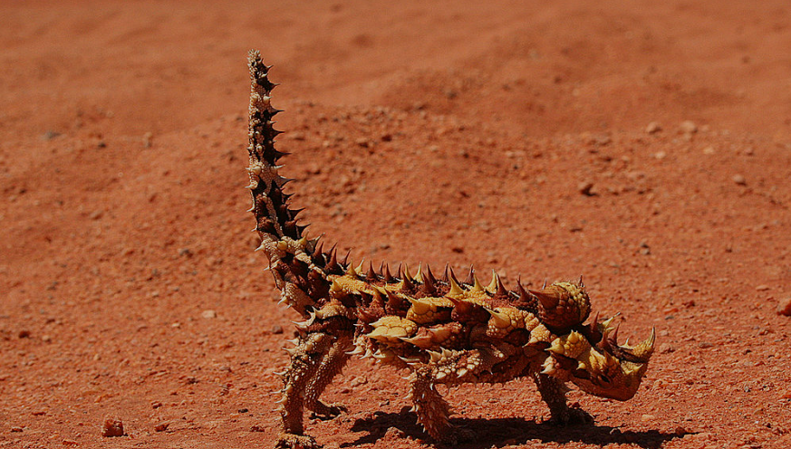 This small, intimidating-looking lizard is covered in thorny spines for defense. Its skin is covered in microscopic grooves that channel dew and moisture from any part of its body directly to its mouth, allowing it to drink from rain, dew, or even damp sand.