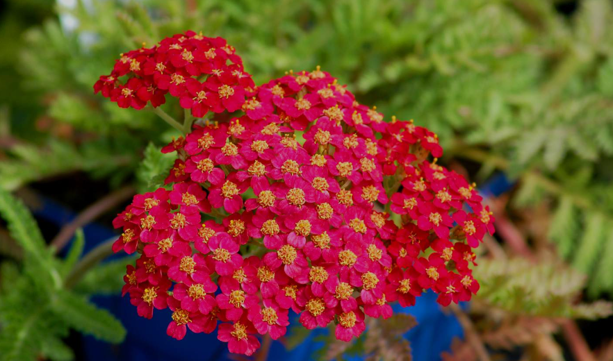 Yarrow offers clusters of flat-topped flowers in vibrant shades of yellow, pink, red, or white, blooming from late spring to early fall. Its fern-like foliage adds texture, and it thrives in hot, dry conditions. Yarrow is drought-tolerant, pollinator-friendly, and excellent for cut or dried flower arrangements.