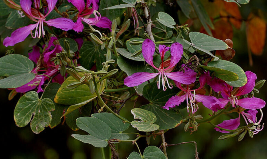 The leaves are bilobed, resembling a camel’s hoof or butterfly wings, and are bright green, turning slightly yellow before dropping in the dry season. Its most striking feature is the large, purple to magenta flowers that bloom profusely in clusters, usually in spring and summer.