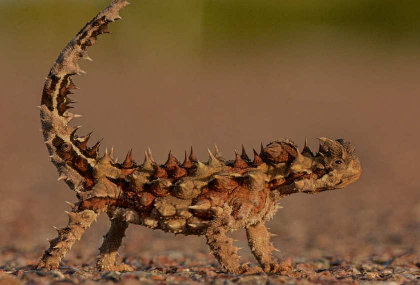 Other aspects of the thorny devil include its diurnal, solitary lifestyle with bimodal activity peaks in autumn and spring-summer, hibernating in burrows during extremes. It is heterothermic, regulating temperature through postural changes, and communicates via visual cues like head-bobbing.