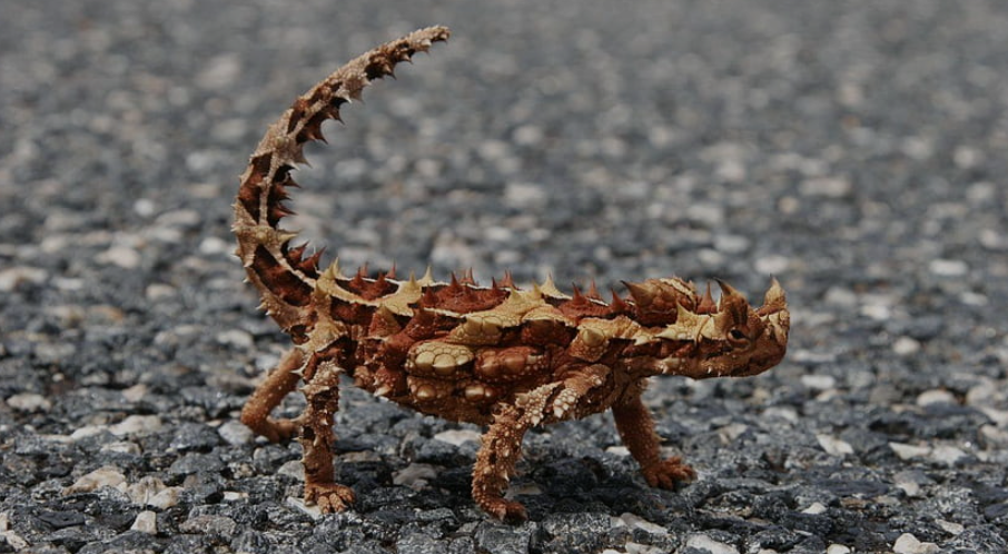 A prominent spiny “false head” on the neck, supported by soft tissue and bony bosses, serves as a decoy, while two large horned scales on the actual head enhance its devilish illusion. The lizard’s skin has ridged, hydrophilic scales with microstructures that facilitate capillary water collection from any body part to the mouth. It moves with a slow, rocking gait, often freezing to blend into surroundings, and exhibits sexual dimorphism in size but similar growth rates until the first year.