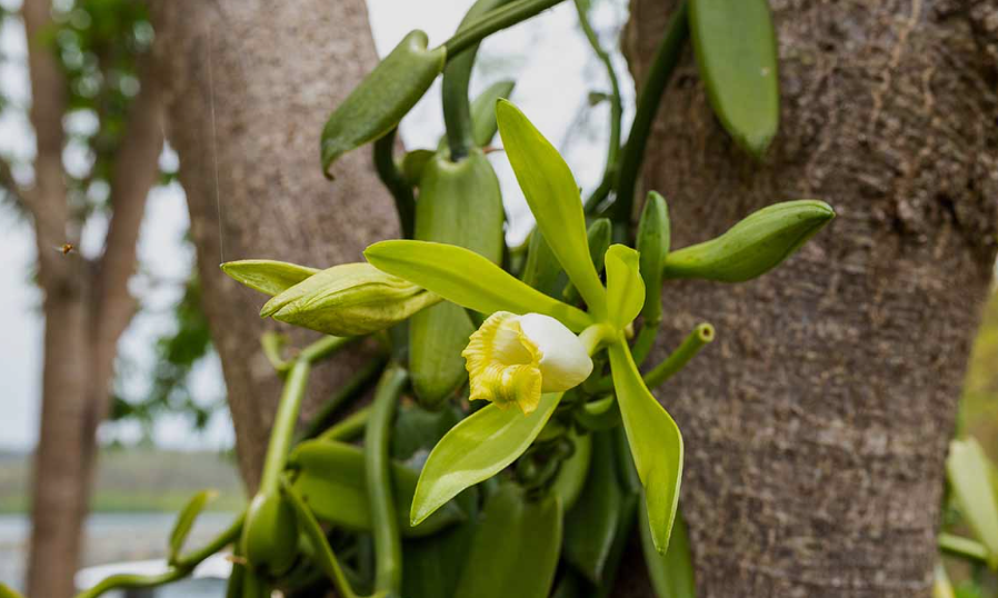 The vanilla orchid is the primary source of natural vanilla flavor. While technically a climbing vine, it grows on trees for support. Its green pods and flowers produce the sweet, aromatic scent that defines vanilla, and the fragrance intensifies as the pods mature.