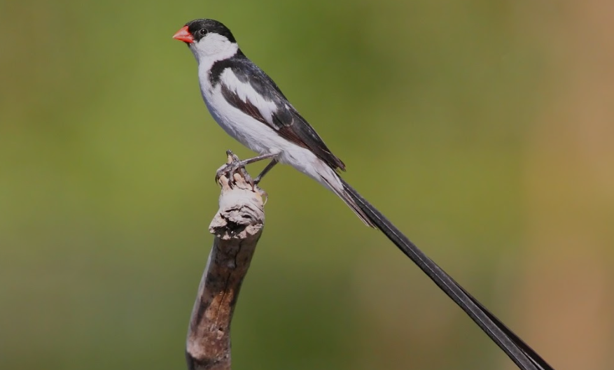 A small African finch, the breeding male Pin-tailed Whydah is a study in contrast, with a black and white body and a remarkably long, slender black tail. This tail, which can be three times the length of its body, is a key feature in its hovering flight display over potential mates.