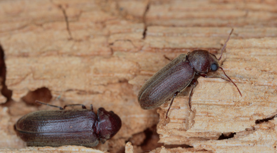 Though mainly a stored-product pest, the lesser grain borer (Rhyzopertha dominica) also attacks dry wooden articles and packaging. The larvae can bore into hard materials, leaving small circular holes that resemble those of powderpost beetles.