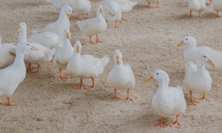 Similar to the American Pekin but developed as a distinct breed in Europe. It has a more upright stance, a fuller breast, and is often raised as a show bird and for meat. It is pure white with an orange bill and legs, known for being robust and a good forager.