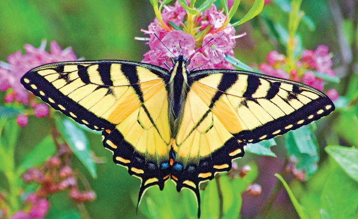 The Two-tailed Swallowtail is one of the largest butterflies in North America, distinguished by its two tail extensions on each hindwing. Its vivid yellow background is laced with bold black stripes, and flashes of blue and orange adorn the hindwing margins, making it a truly spectacular species of the American West.